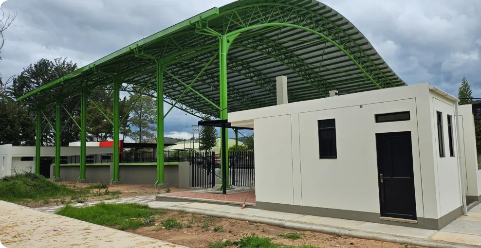 Se ejecutó la construcción de cimentación en concreto reforzado por zapatas aisladas y vigas de conexión con pedestales, sobre los cuales se izaron columnas en estructura metálica enlazadas por un entramado de cerchas y correas según diseño estructural, sobre la cual se apoyó teja tipo Skydeck. La cubierta tiene un área de 1.758 m² con forma meándrica, con descarga de aguas lluvias mediante canales en lámina y bajantes en PVC conectadas a cajas de inspección, así como un sistema de apantallamiento para descargas eléctricas.